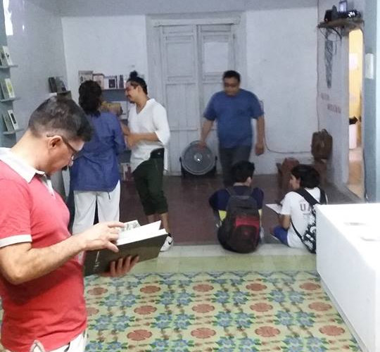 La misma noche de la inauguración de al Maleta Mexicana contamos la genial colaboración del artista yucateco Gabriel Quintal quién además de actuar como mediador de un breve juego de lectura al mero estilo Cadáver Exquisito basado en el mini poemario "En tu Tumba " (pieza de la expo) interpretó un breve acto (no quiero decir performance) con el cuál nos dejó sorprendidos o con el corazón desmembrado , como escribí todo fue un experimento .